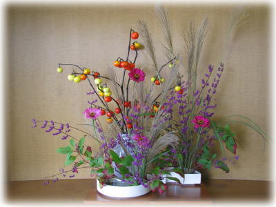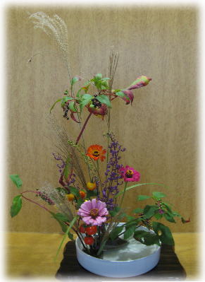 【今回の花材は、赤ナス、紫式部、薄(ススキ)、百日草、山ごぼうです】