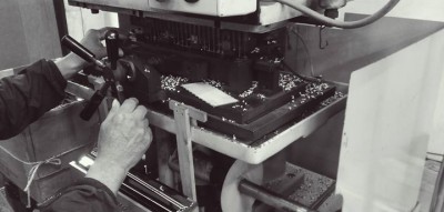 中桟に軸穴を機械で一気にあけていく工程です。