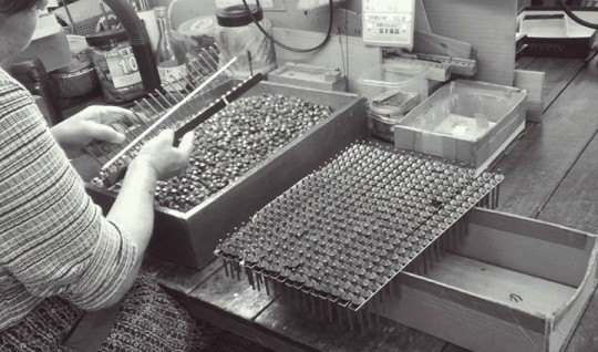 玉を1列に並べる細い箱のような道具を右手に持ち、